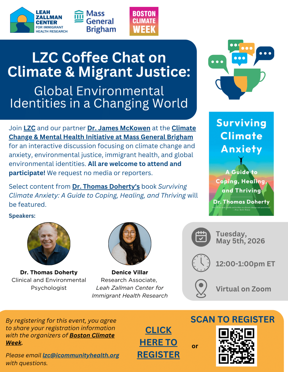 Join LZC and our partner Dr. James McKowen at the Climate Change & Mental Health Initiative at Mass General Brigham for the LZC Coffee Chat on Climate & Migrant Justice: Global Environmental Identities in a Changing World. This interactive discussion will focus on climate change and anxiety, environmental justice, immigrant health, and global environmental identities. Select content from Dr. Thomas Doherty’s book Surviving Climate Anxiety: A Guide to Coping, Healing, and Thriving will be featured.